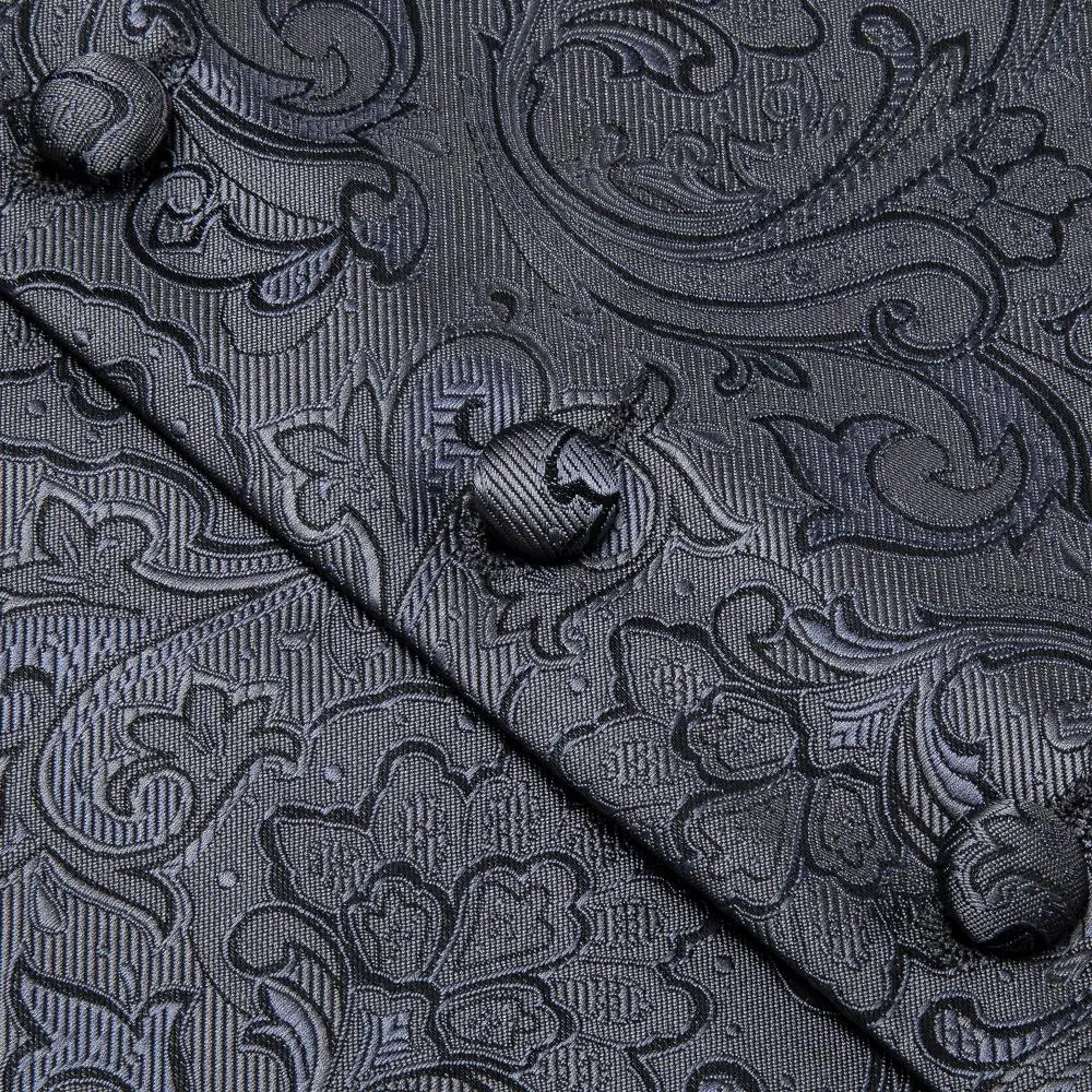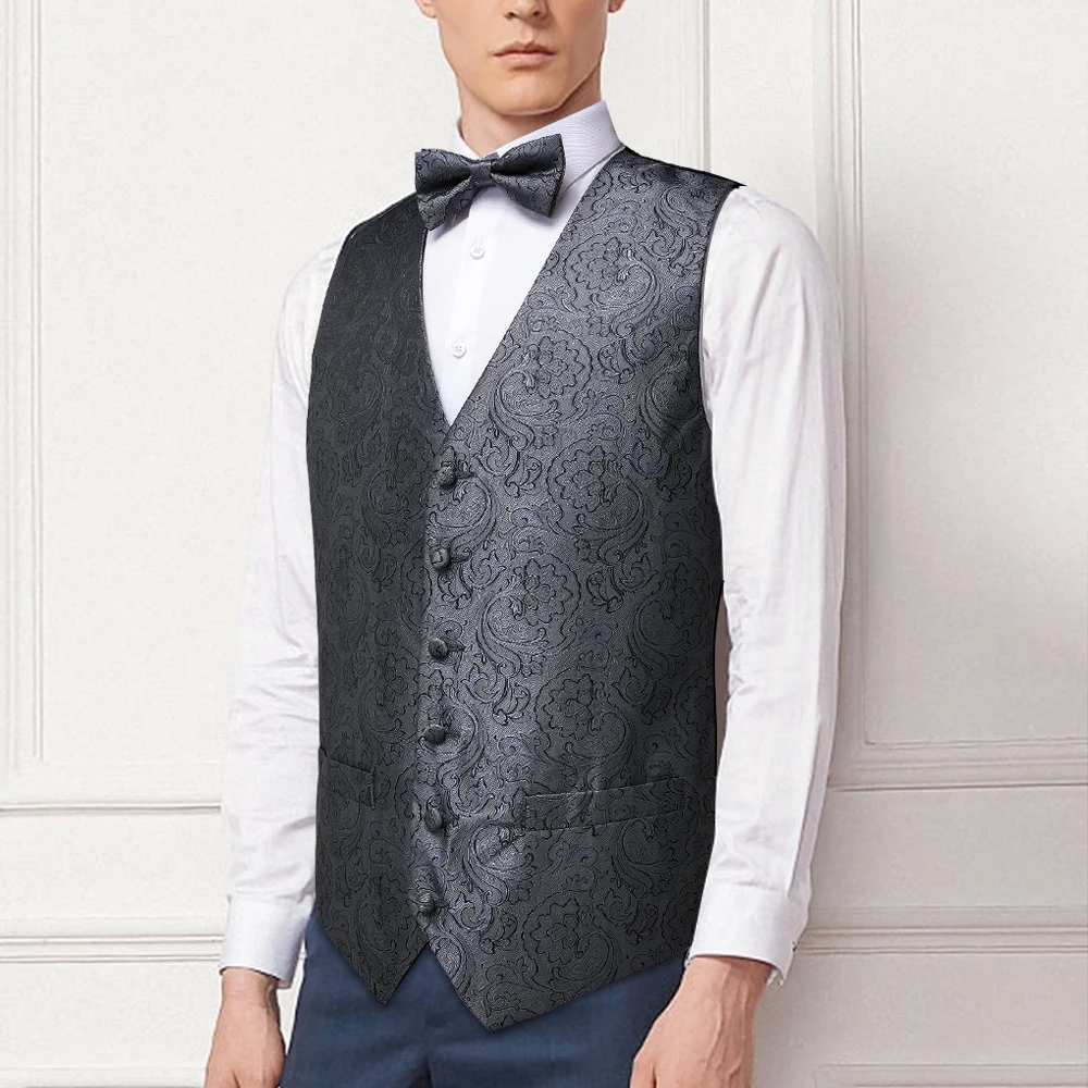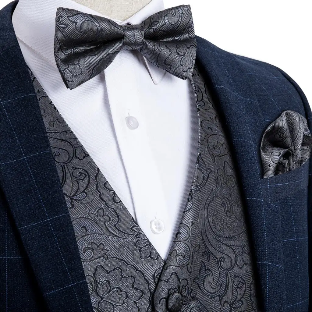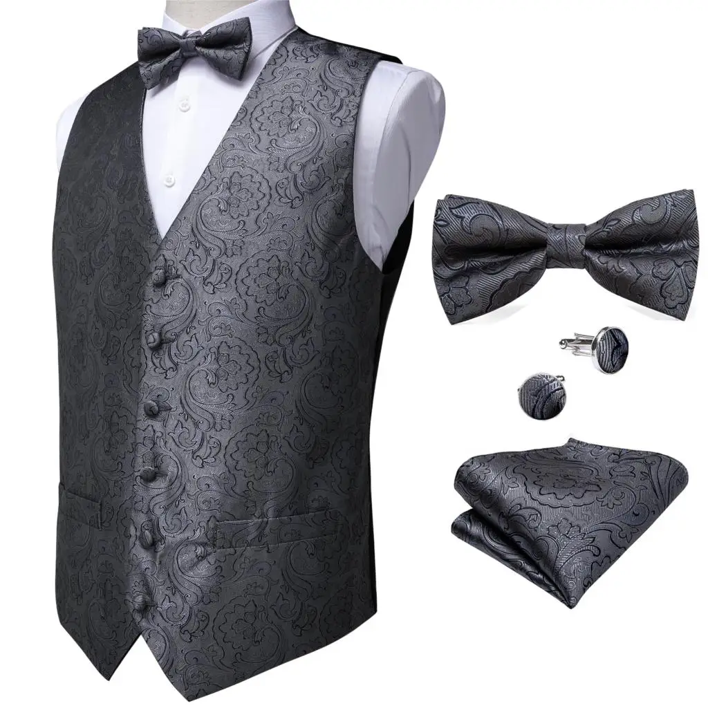 | Mens Classic Party Wedding Paisley Jacquard Gray Waistcoat Barry.Wang Silk Vest Pocket Square Bow Tie Cufflinks Set DiBanGu |
